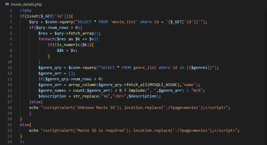 Upon examining the movie_details.php file, which displays movie details, we see that the id parameter is included directly in the SQL query without sufficient security measures.